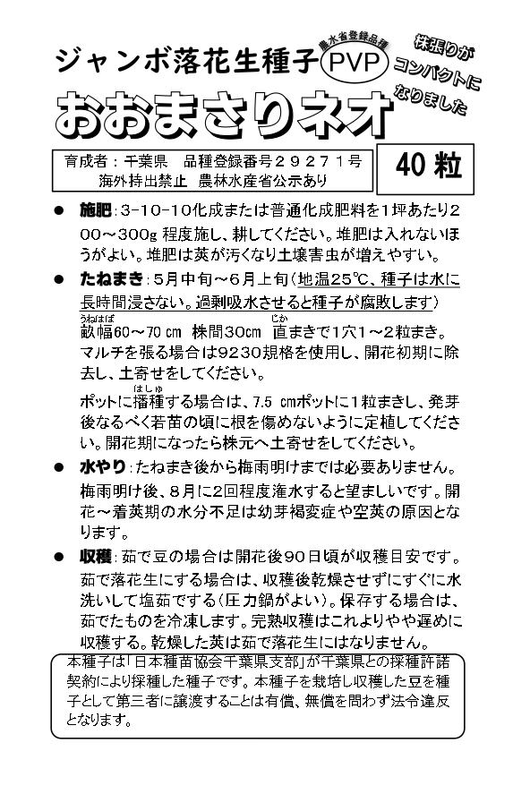 おおまさりネオは農水省登録品種です、種苗法により種子の無断増殖、第三者への譲渡は有償、無償を問わず禁じられています。また、海外への持出も禁止です。厳守してください。
